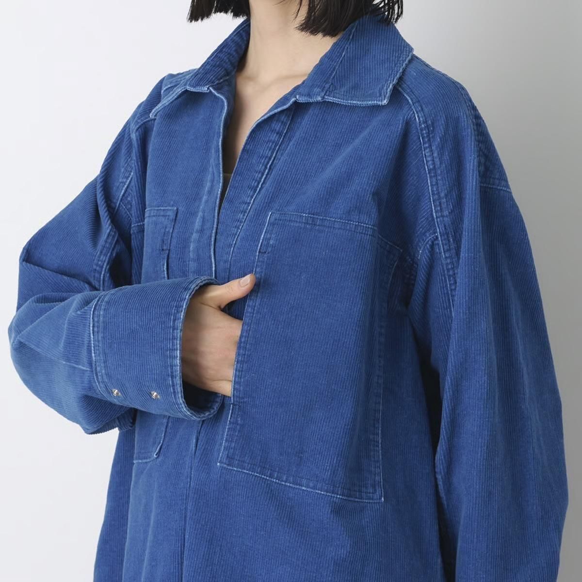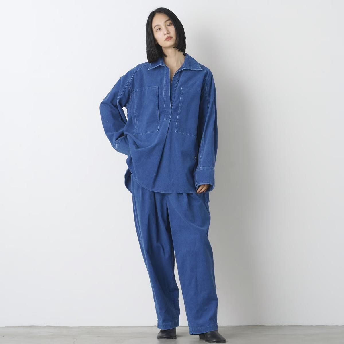 商品説明:インディゴ染めのコーデュロイ素材を、色によって異なるヴィンテージ加工を施したワークウエアのシリーズ。