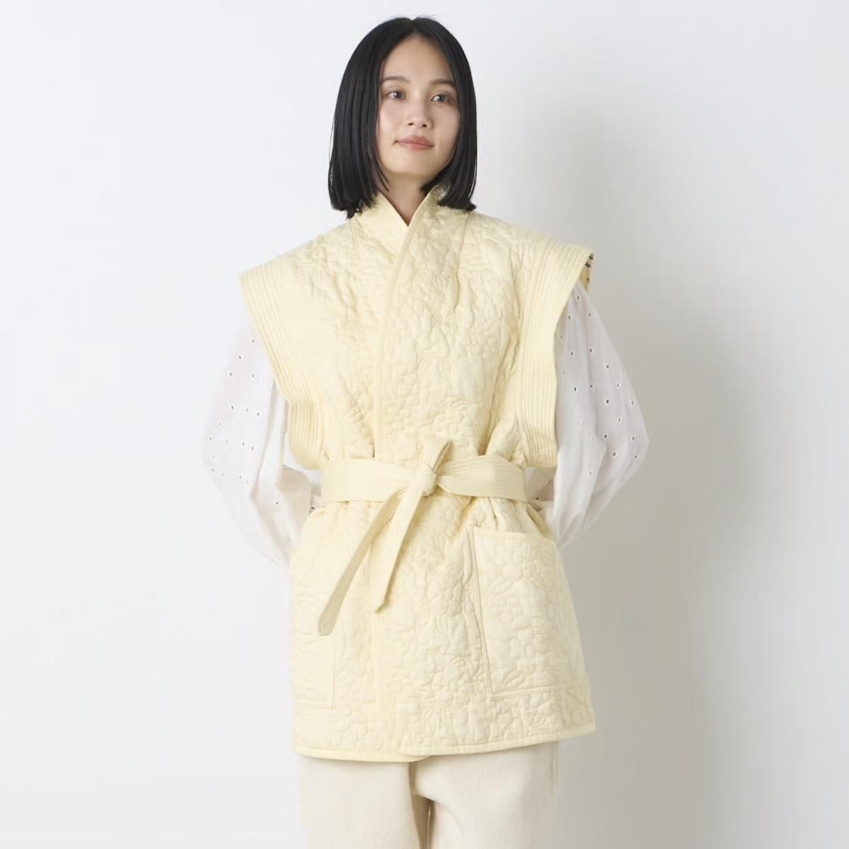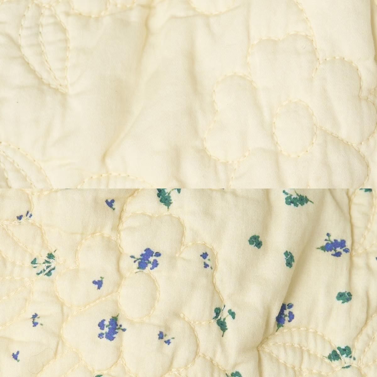 商品説明:表側にそれぞれ異なるオリジナルプリントを組み合わせ、花柄のオリジナルのキルティング刺繍を施した、リバーシブル仕立てのベストになります。別ベルト付きになります。