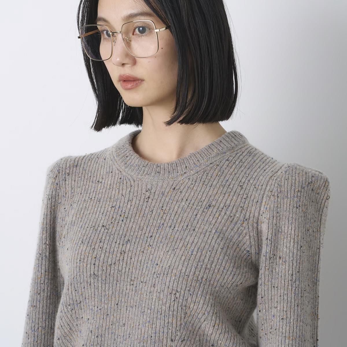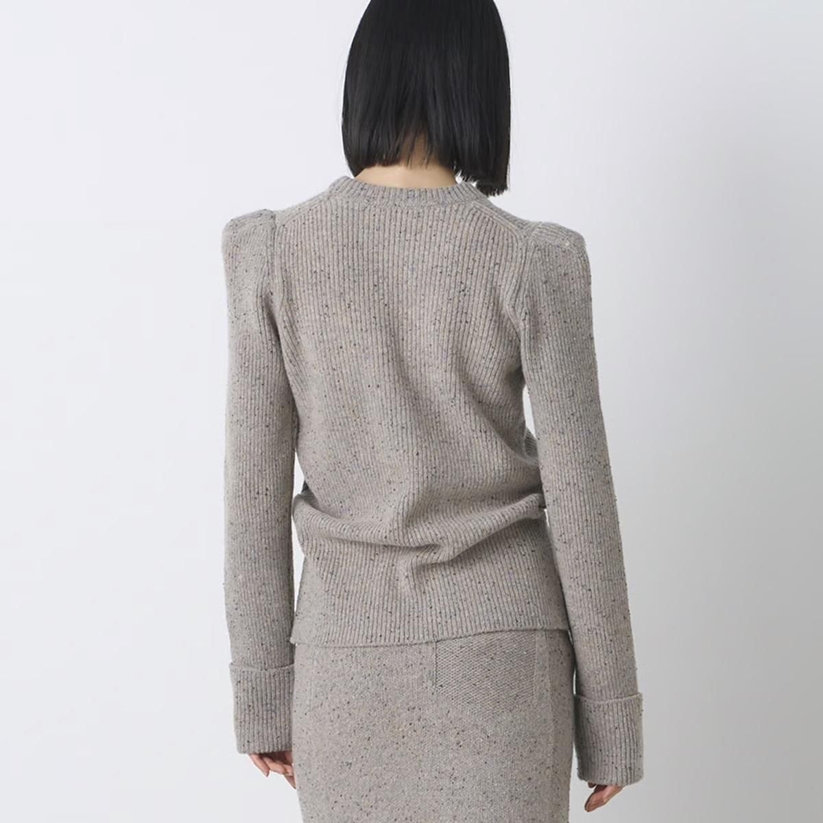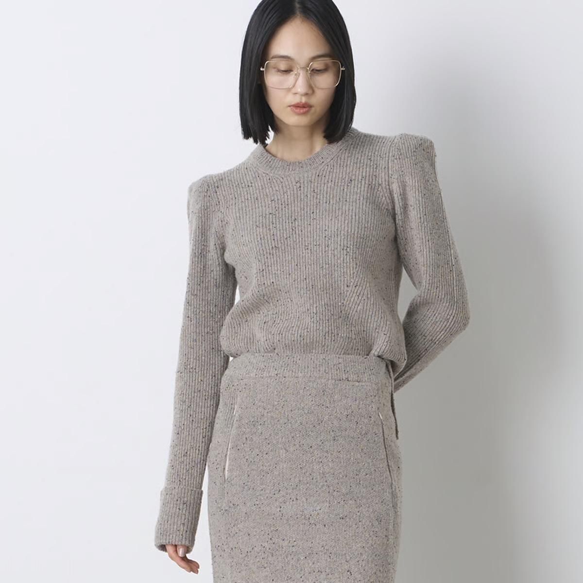 商品説明:カラーネップツイードのウールナイロン糸を使用したニットプルオーバーです。コンパクトなボディに強調されたショルダーラインがポイント。