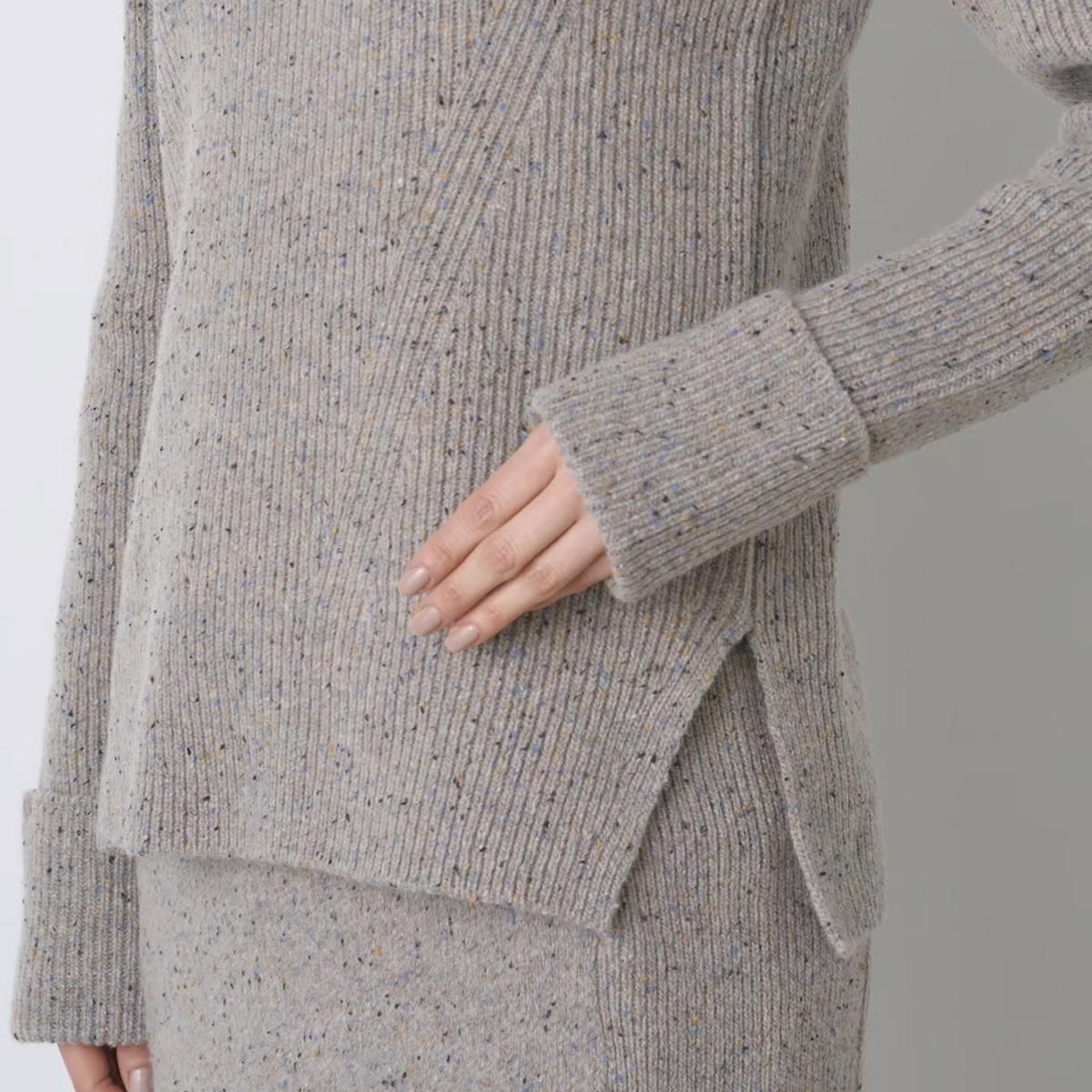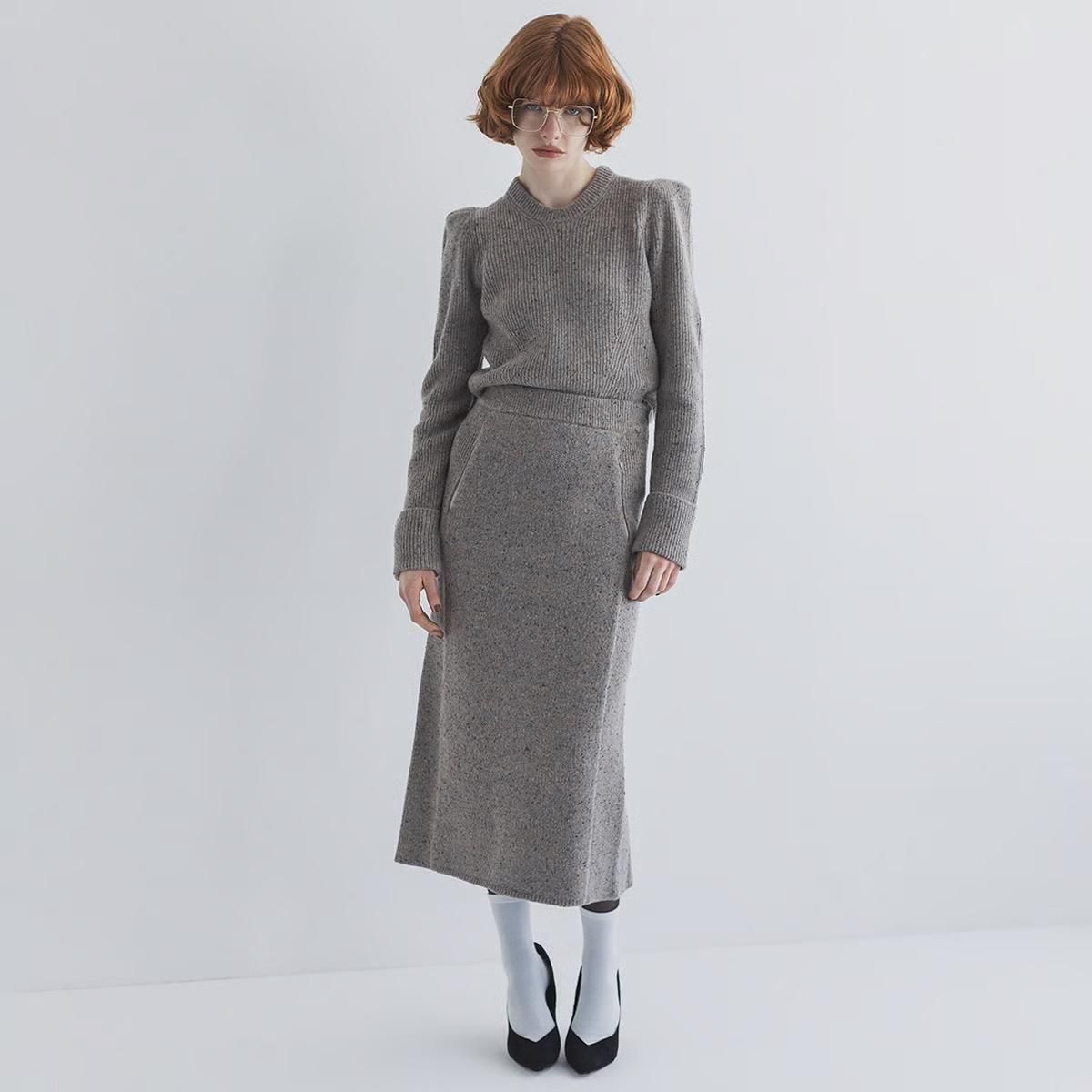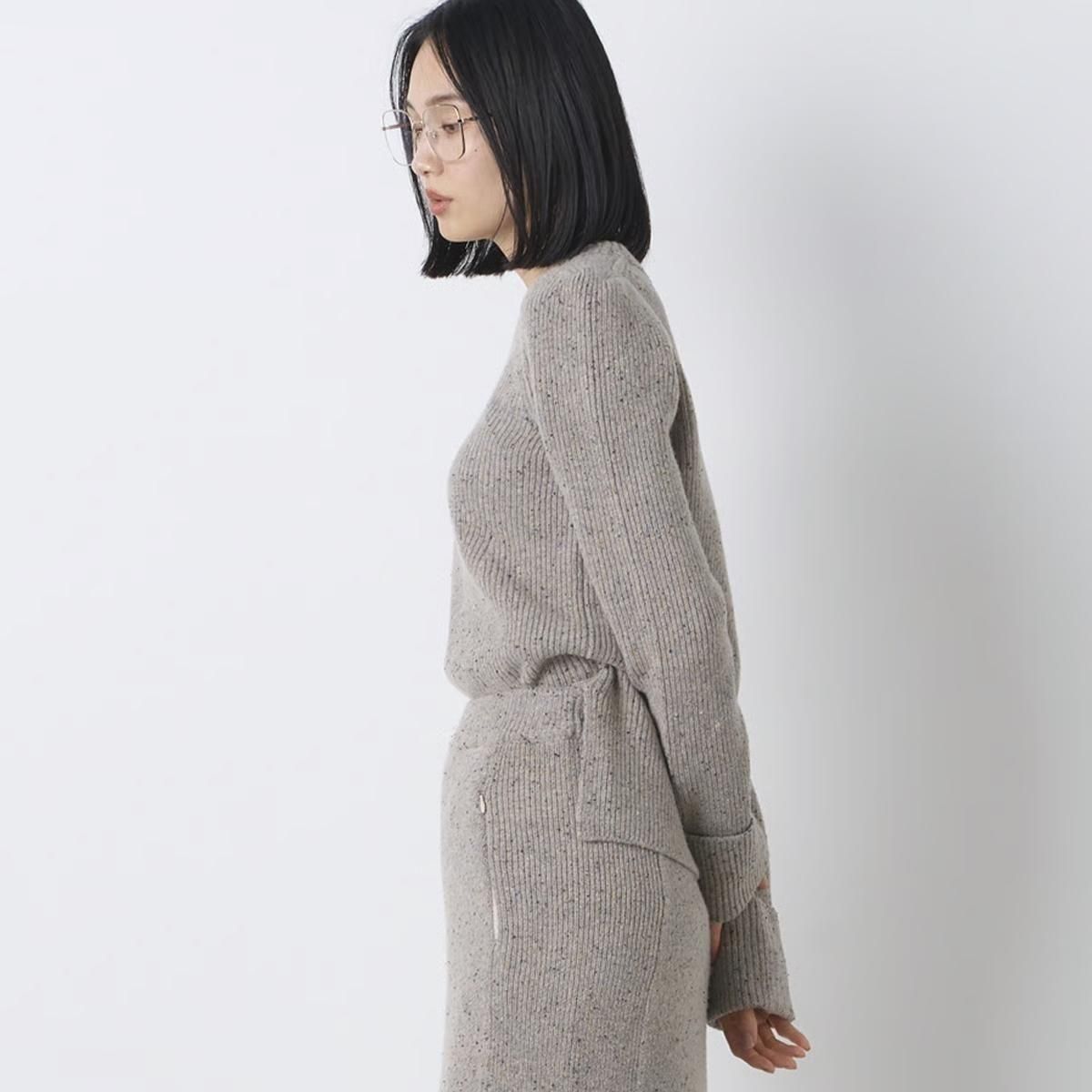商品説明:カラーネップツイードのウールナイロン糸を使用したニットプルオーバーです。コンパクトなボディに強調されたショルダーラインがポイント。