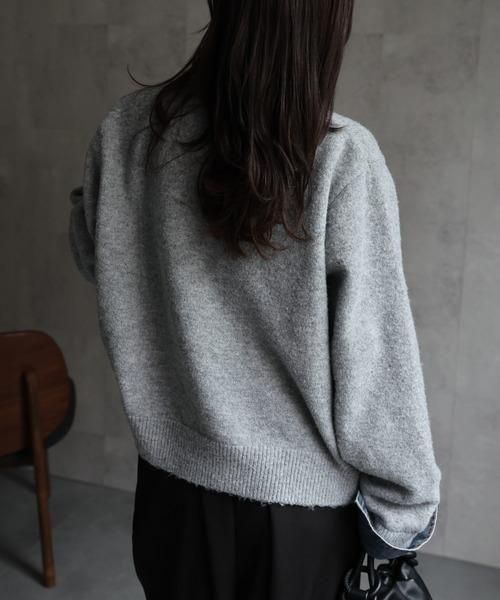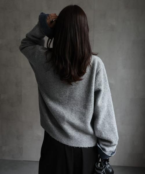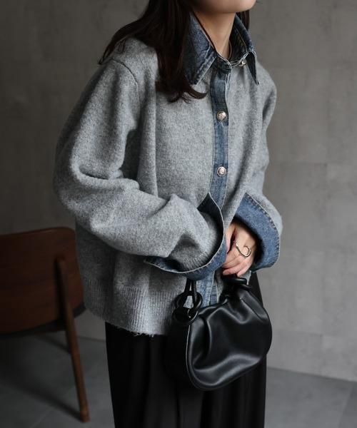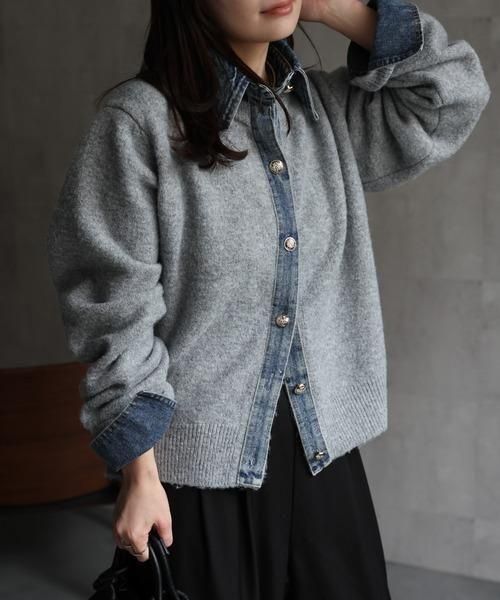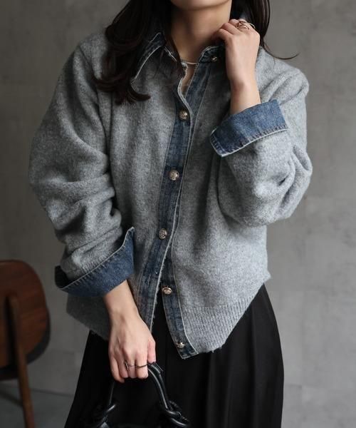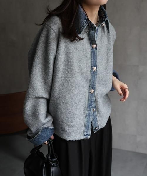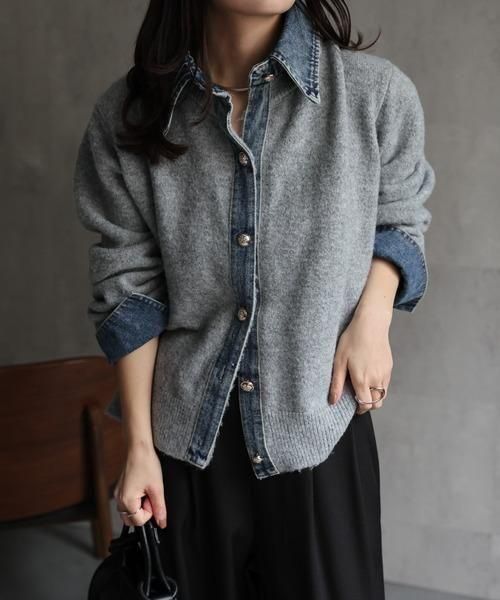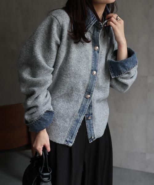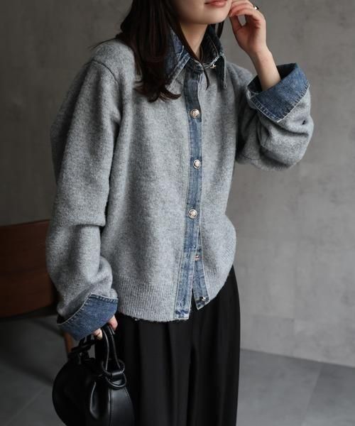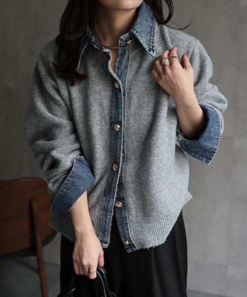 商品名:デニム×ニット ドッキングカーディガン〈グレー〉