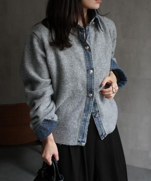 デニム×ニット ドッキングカーディガン〈グレー〉